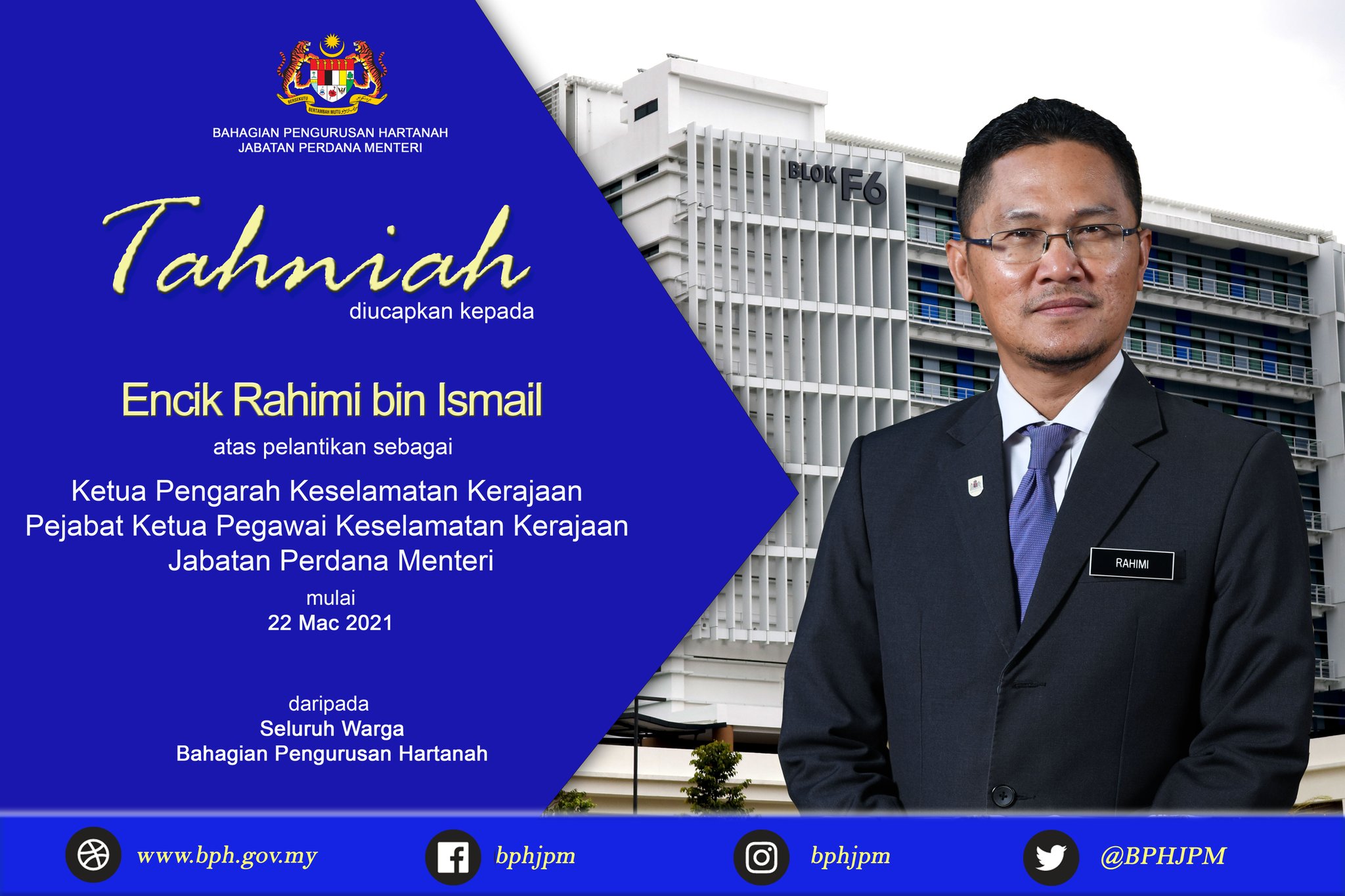 Twitter 上的 Bahagian Pengurusan Hartanah Sekalung Tahniah Diucapkan Kepada Encik Rahimi Bin Ismail Atas Pelantikan Sebagai Ketua Pengarah Keselamatan Kerajaan Pejabat Ketua Pegawai Keselamatan Kerajaan Jabatan Perdana Menteri Mulai 22 Mac 2021